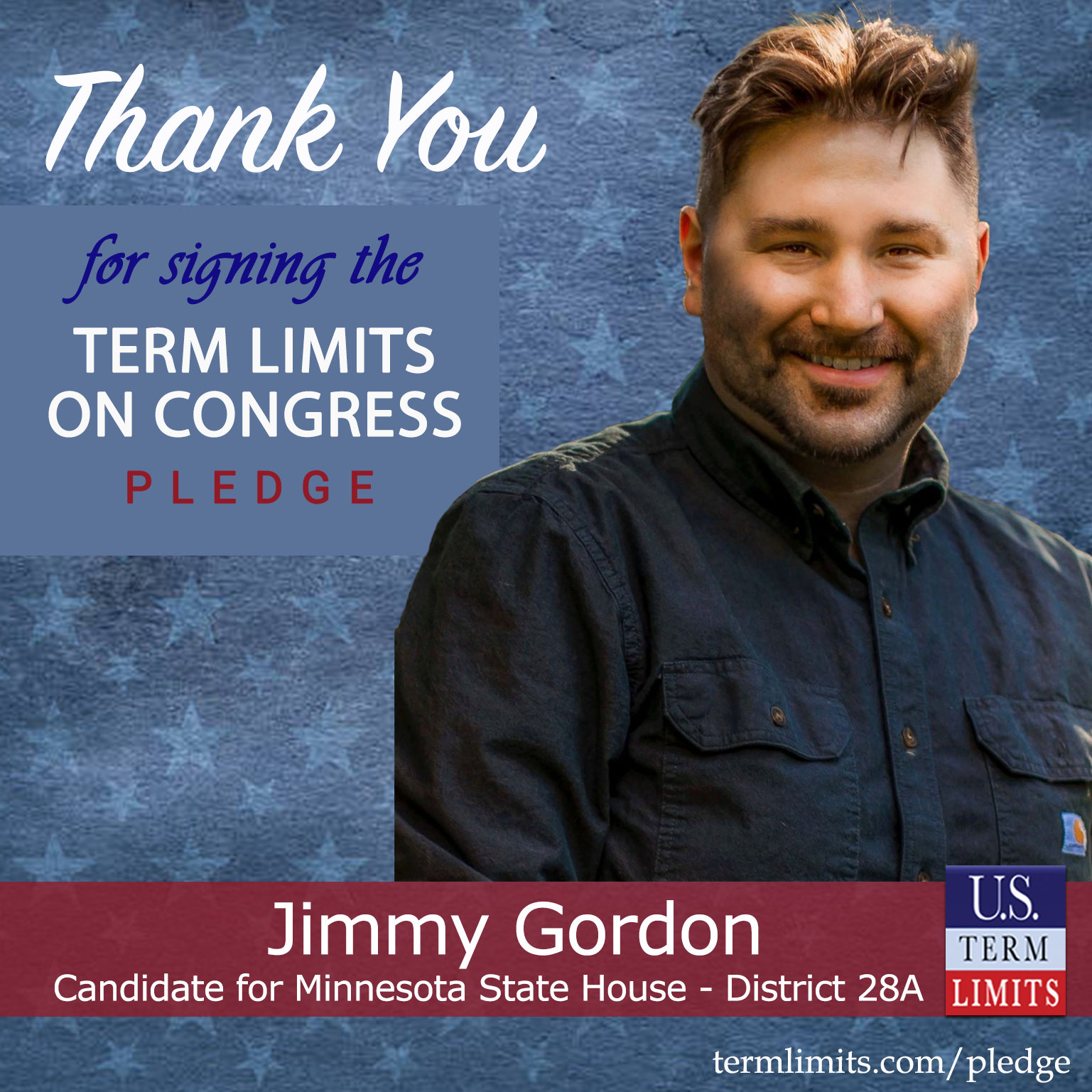 Isanti, MN – U.S. Term Limits (USTL), the leader in the national, non-partisan movement to limit terms for elected officials, is gathering support from state lawmakers across the nation. Its mission is to get 34 states to apply for an amendment proposal convention specific to term limits on Congress. Minnesota state house candidate, Jimmy Gordon (District 28A), has committed support for term limits on Congress by signing the Term Limits Convention Pledge.