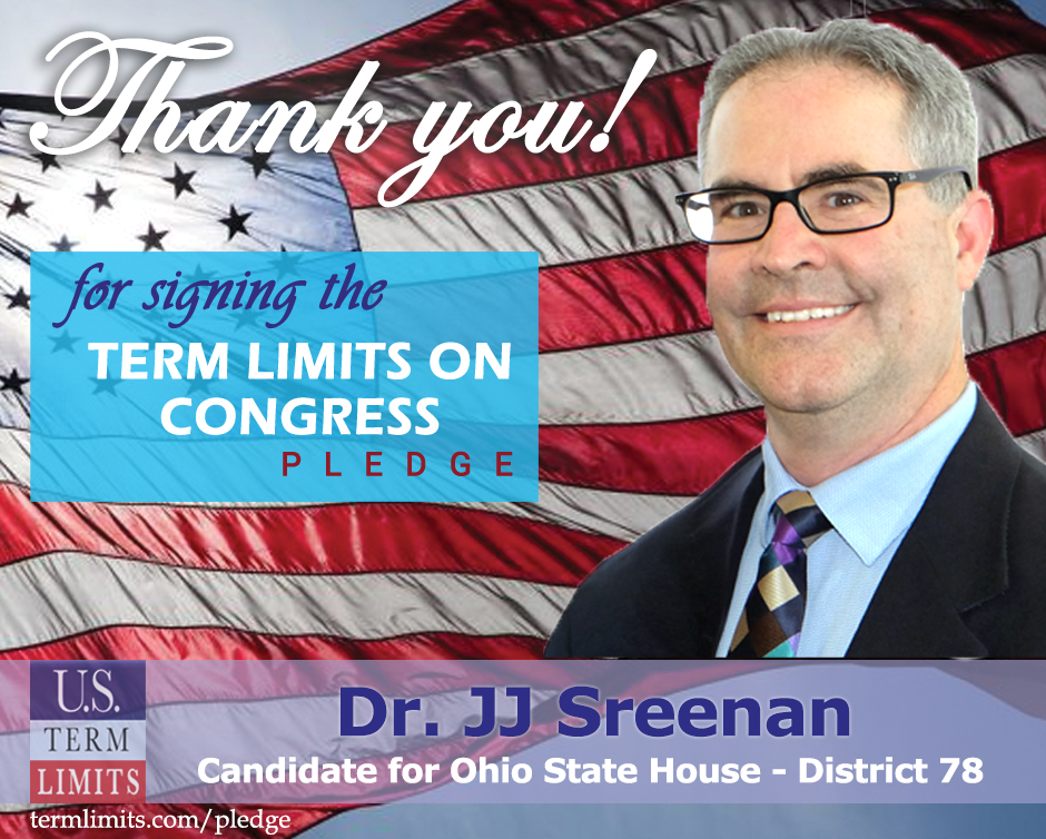 Columbus, OH – U.S. Term Limits (USTL), the leader in the national, non-partisan movement to limit terms for elected officials, is gathering support from state lawmakers across the nation. Its mission is to get 34 states to apply for an amendment proposal convention specific to term limits on Congress. Ohio state house candidate, Dr. JJ Sreenan (district 78) has committed support for term limits on Congress by signing the Term Limits Convention pledge. Sreenan is the first signer in this race.