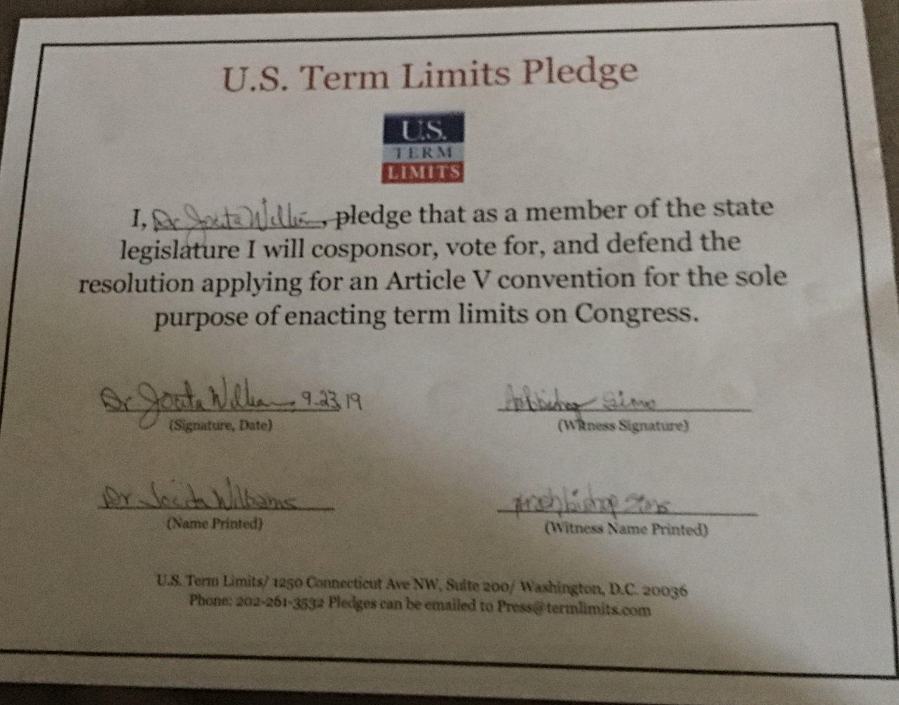 USTL President, Philip Blumel, commented on Williams’s pledge saying, “Jocita’s support of term limits shows that there are individuals who are willing to listen to the majority of voters who want term limits. America needs a Congress that will be served by citizen legislators, not career politicians.”