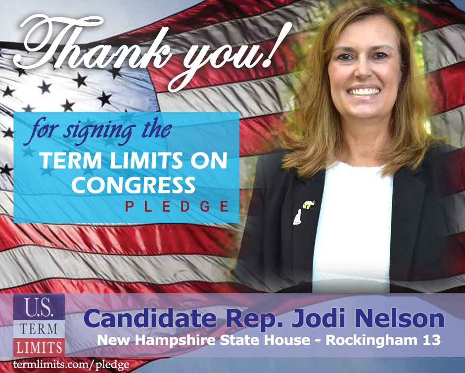 Derry, NH – U.S. Term Limits (USTL), the leader in the national, non-partisan movement to limit terms for elected officials, is gathering support from state lawmakers across the nation. Its mission is to get 34 states to apply for an amendment proposal convention specific to term limits on Congress. New Hampshire state house candidate, Rep. Jodi Nelson (Rockingham 13) has committed support for term limits on Congress by signing the Term Limits Convention pledge.