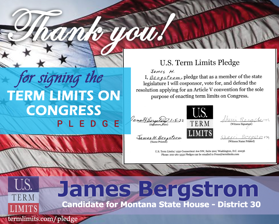 The U.S. Term Limits pledge is provided to candidates and members of state legislatures. It reads, “I pledge that, as a member of the state legislature, I will cosponsor, vote for, and defend the resolution applying for an Article V convention for the limited purpose of enacting term limits on Congress.”