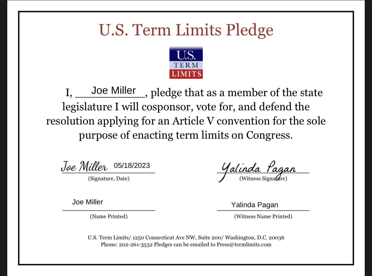 Joe Miller and Yalinda Pagán Pledge to Support Congressional Term Limits
