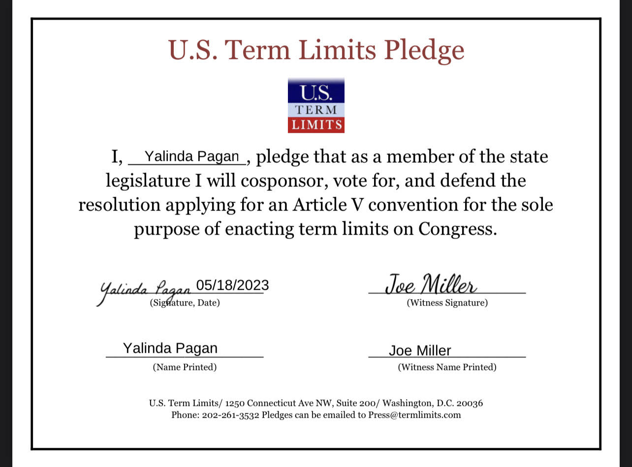 Camden, NJ– U.S. Term Limits (USTL), the leader in the national, non-partisan movement to limit terms for elected officials, is gathering support from state lawmakers across the nation. Its mission is to get 34 states to apply for an amendment proposal convention specific to term limits on Congress. New Jersey state assembly candidates, Joe Miller and Yalinda Pagán (district 5), have committed support for term limits on Congress by signing the Term Limits Convention pledge. The primary election is scheduled for June 6, 2023.