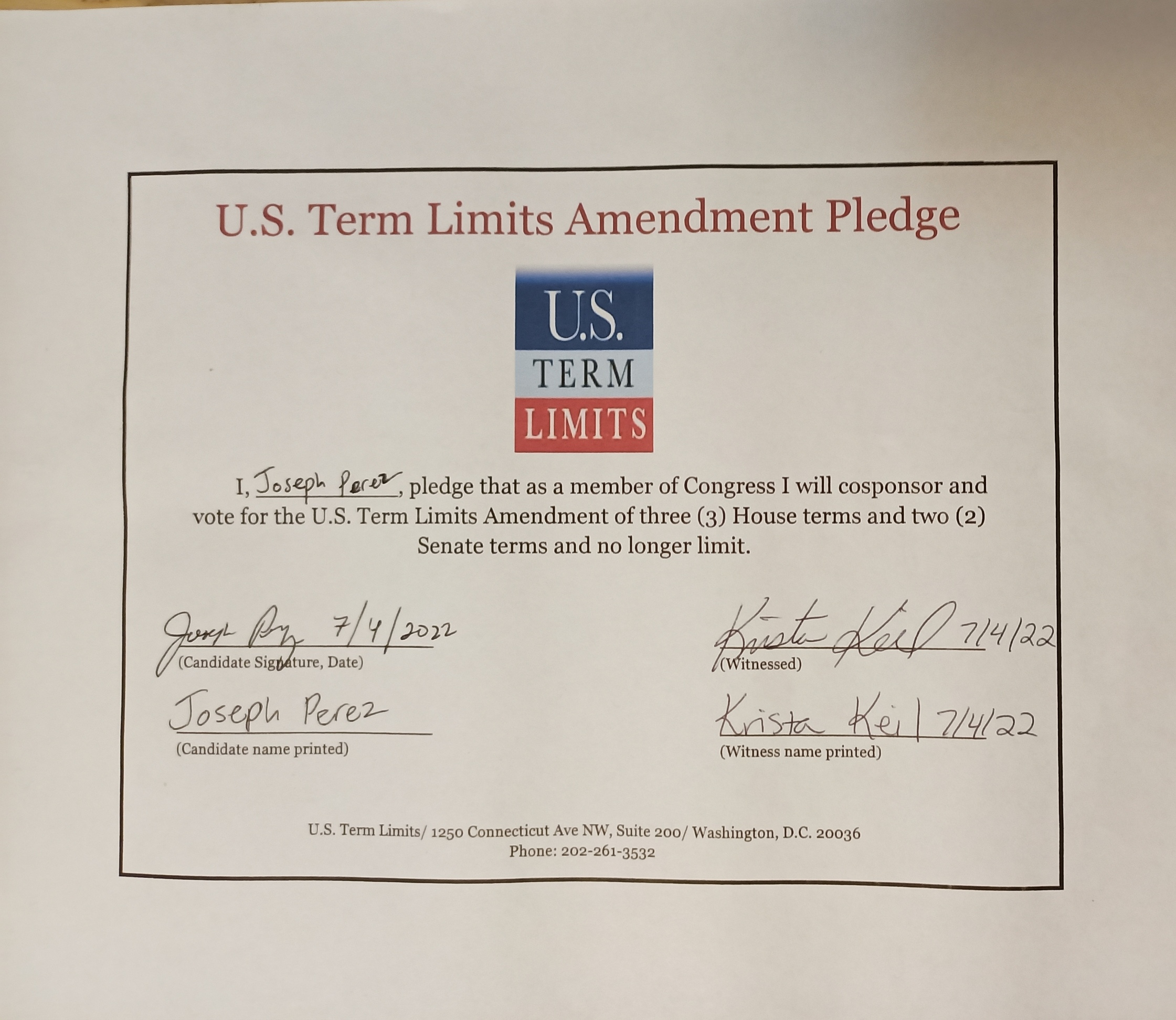 Washington D.C. – U.S. Term Limits (USTL), the leader in the non-partisan national movement to limit terms for elected officials, praises 2022 U.S. Senate candidate for Maryland, Joe Perez , for signing the pledge for an amendment to term limit Congress. Previously, candidates Lorie Friend, Eze Nnubu, John Thormann and James Tarantin also signed the pledge.