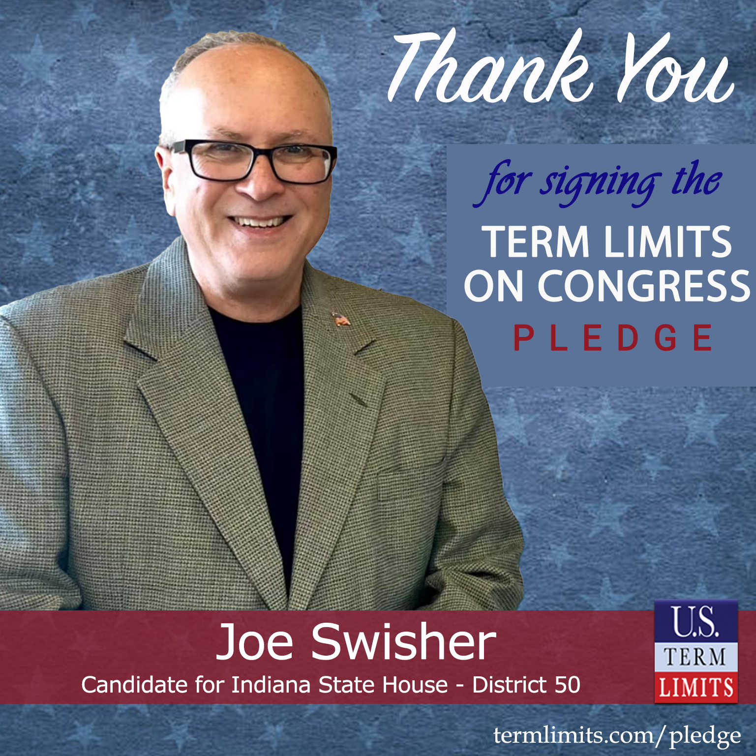 Wabash, IN – U.S. Term Limits (USTL), the leader in the national, non-partisan movement to limit terms for elected officials, is gathering support from state lawmakers across the nation. Its mission is to get 34 states to apply for an amendment proposal convention specific to term limits on Congress. Indiana state house candidate, Joe Swisher (District 50), has committed support for term limits on Congress by signing the Term Limits Convention Pledge.