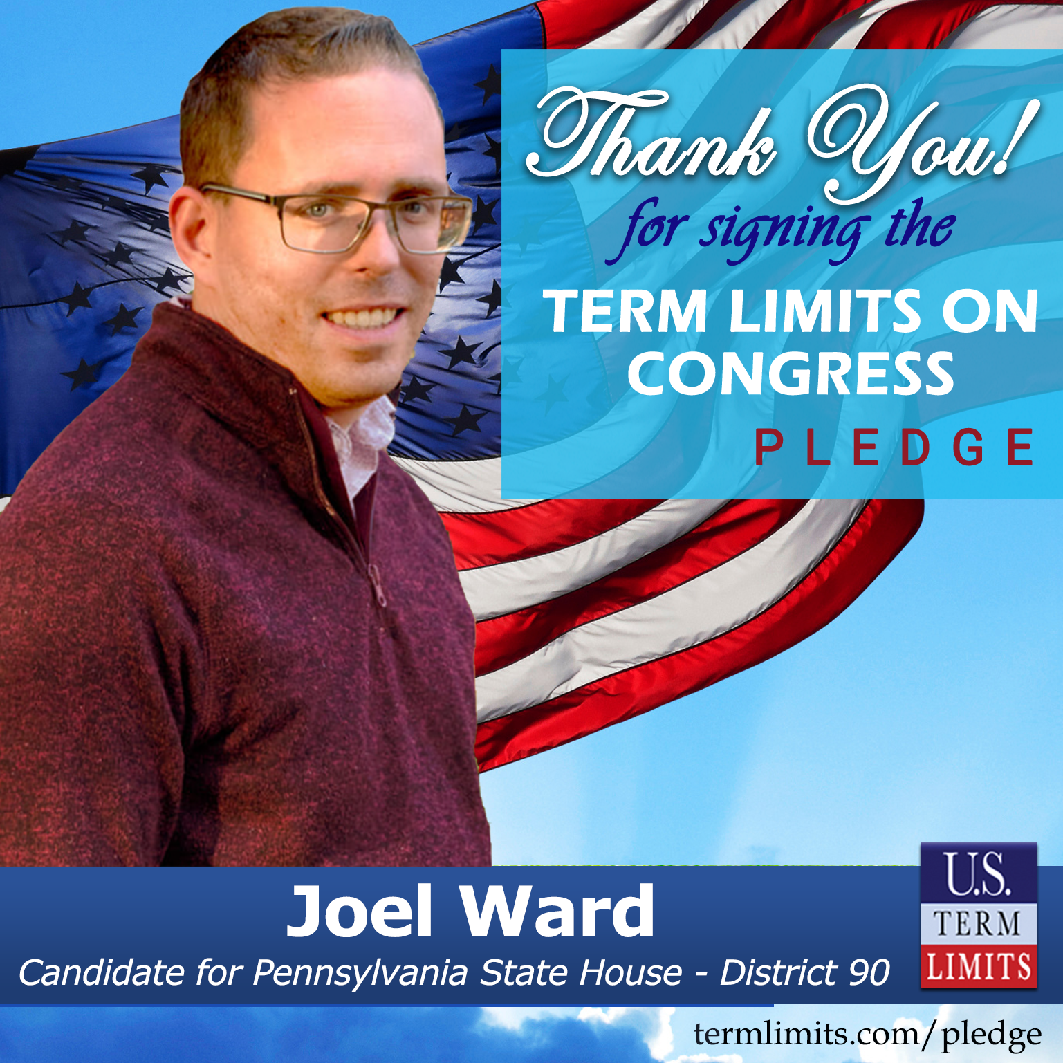 Waynesboro, PA – U.S. Term Limits (USTL), the leader in the national, non-partisan movement to limit terms for elected officials, is gathering support from state lawmakers across the nation. Its mission is to get 34 states to apply for an amendment proposal convention specific to term limits on Congress. Pennsylvania state house candidate, Joel Ward (district 90), has committed support for term limits on Congress by signing the Term Limits Convention Pledge. Ward is the first signer in this race.