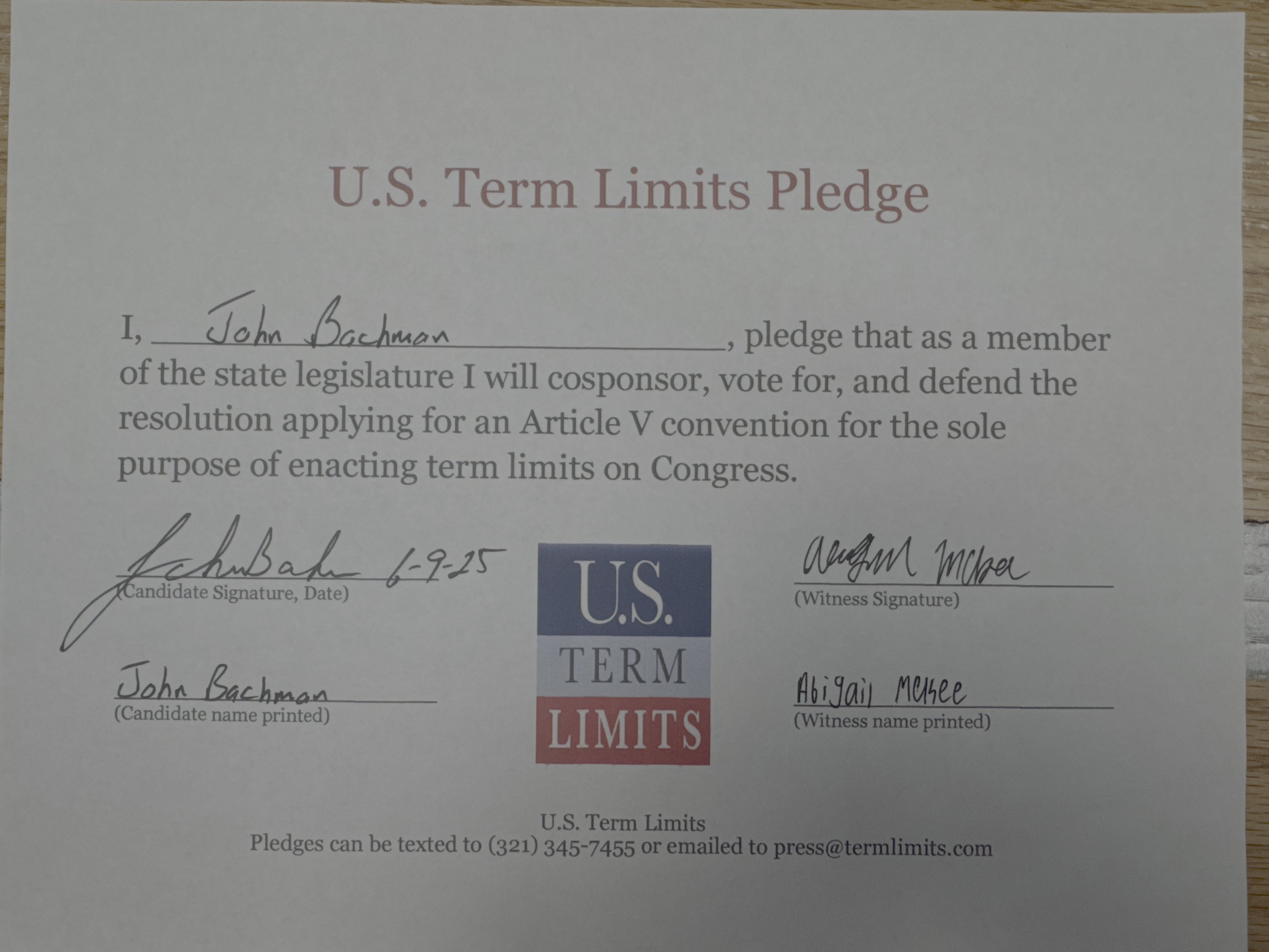 Edmond, OK – U.S. Term Limits (USTL), the leader in the national, non-partisan movement to limit terms for elected officials, is gathering support from state lawmakers across the nation. Its mission is to get 34 states to apply for an amendment proposal convention specific to term limits on Congress. 2026 Oklahoma state house candidate, John Bachman (district 96), has committed support for term limits on Congress by signing the term limits convention pledge.