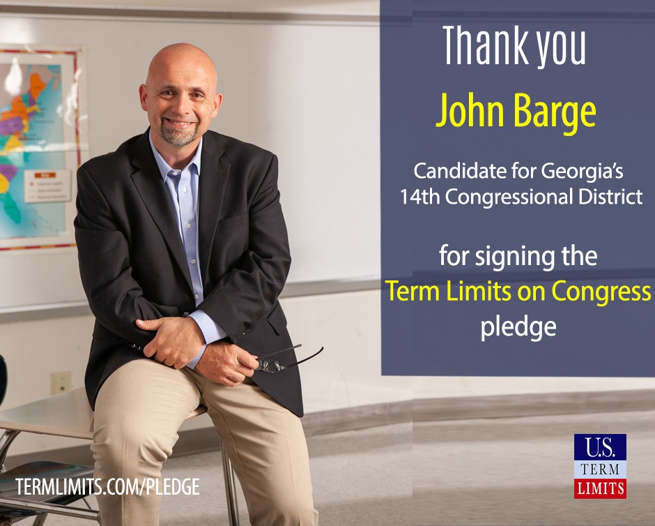 Washington, DC – U.S. Term Limits (USTL), the leader in the non-partisan national movement to limit terms for elected officials, praises 2020 U.S. house candidate for Georgia (district 14), John Barge, for signing the pledge for an amendment to term limit Congress.  Previously six other candidates, John Cowan, Bill Hembree, Kevin Cooke, Matt Laughridge, Clayton Fuller and Marjorie Taylor Greene, also signed the pledge. The GA CD-14 election is scheduled for June 9, 2020.