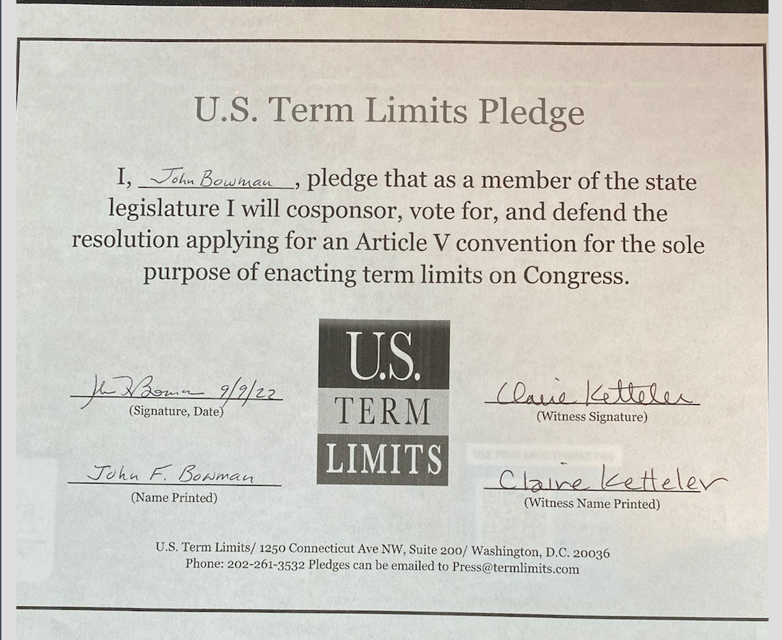USTL President, Philip Blumel, commented on Bowman’s pledge saying, “John’s support of term limits shows that there are individuals who are willing to listen to the majority of voters who want term limits. America needs a Congress that will be served by citizen legislators, not career politicians.”