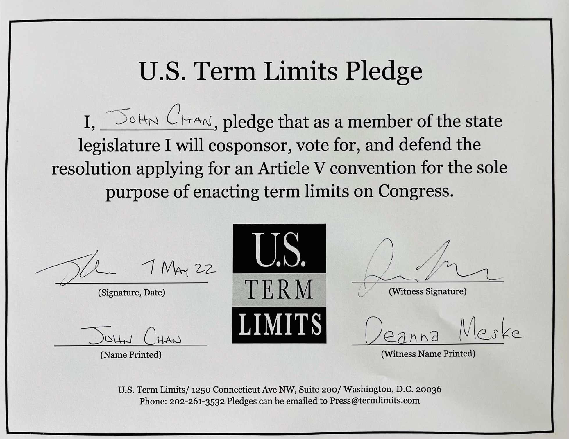 USTL President, Philip Blumel, commented on Chan’s pledge saying, “John’s support of term limits shows that there are individuals who are willing to listen to the majority of voters who want term limits. America needs a Congress that will be served by citizen legislators, not career politicians.”