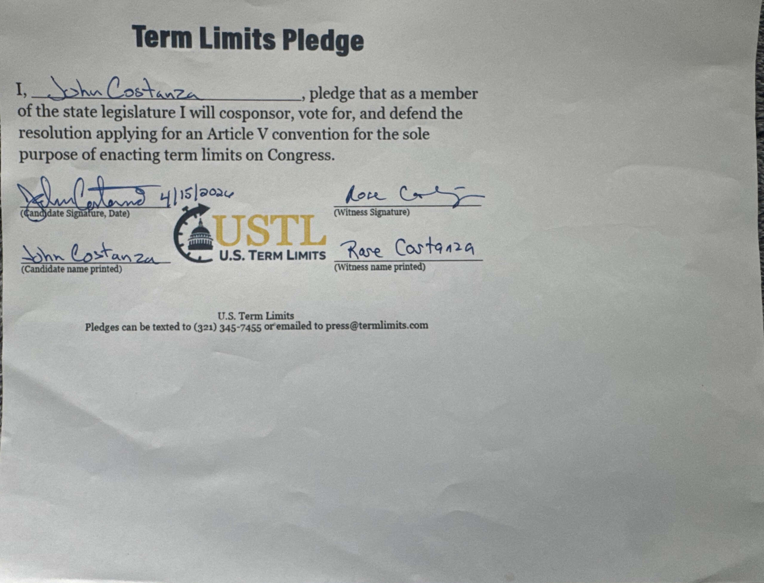 Ambridge, PA – U.S. Term Limits (USTL), the leader in the national, non-partisan movement to limit terms for elected officials, is gathering support from state lawmakers across the nation. Its mission is to get 34 states to apply for an amendment proposal convention specific to term limits on Congress. 2026 Pennsylvania state house candidate, John Costanza (district 16), has committed support for term limits on Congress by signing the term limits convention pledge.