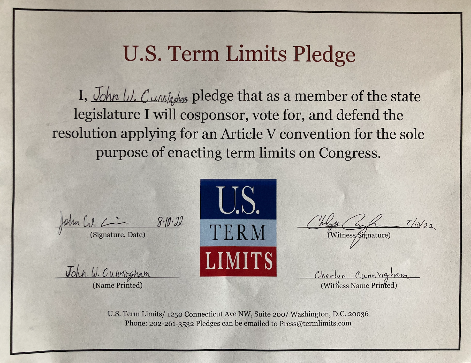 USTL President, Philip Blumel, commented on Cunningham’s pledge saying, “John’s support of term limits shows that there are individuals who are willing to listen to the majority of voters who want term limits. America needs a Congress that will be served by citizen legislators, not career politicians.”