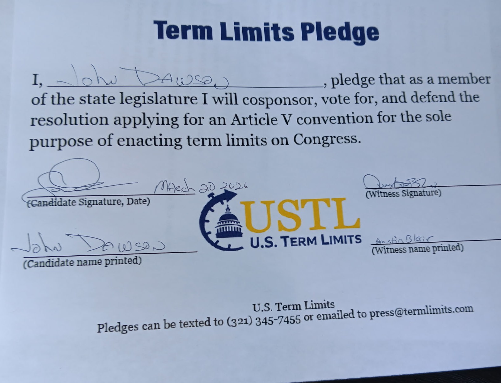 Dunnavant, AL – U.S. Term Limits (USTL), the leader in the national, non-partisan movement to limit terms for elected officials, is gathering support from state lawmakers across the nation. Its mission is to get 34 states to apply for an amendment proposal convention specific to term limits on Congress. 2026 Alabama state house candidate, John Dawson (district 45), has committed support for term limits on Congress by signing the term limits convention pledge. Previously, candidate Toni Vaughn also signed.