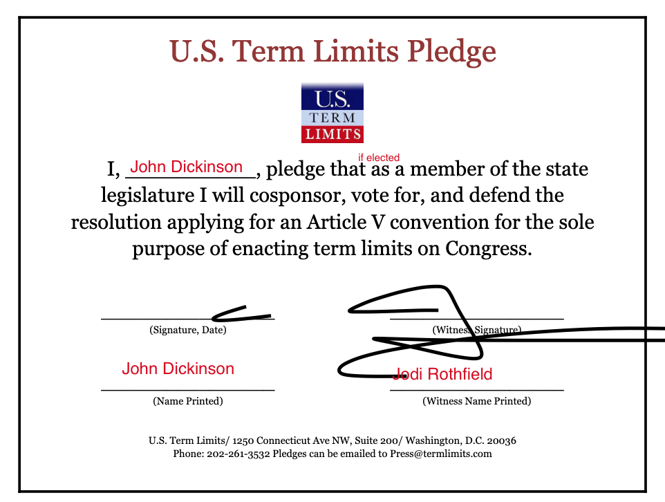USTL President, Philip Blumel, commented on Dickinson’s pledge saying, “John’s support of term limits shows that there are individuals who are willing to listen to the majority of voters who want term limits. America needs a Congress that will be served by citizen legislators, not career politicians.”