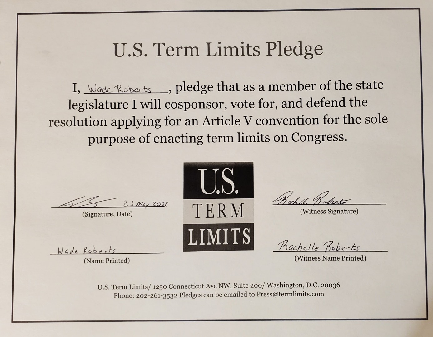 The U.S. Term Limits pledge is provided to candidates and members of state legislatures. It reads, “I pledge that, as a member of the state legislature, I will cosponsor, vote for, and defend the resolution applying for an Article V convention for the limited purpose of enacting term limits on Congress.”