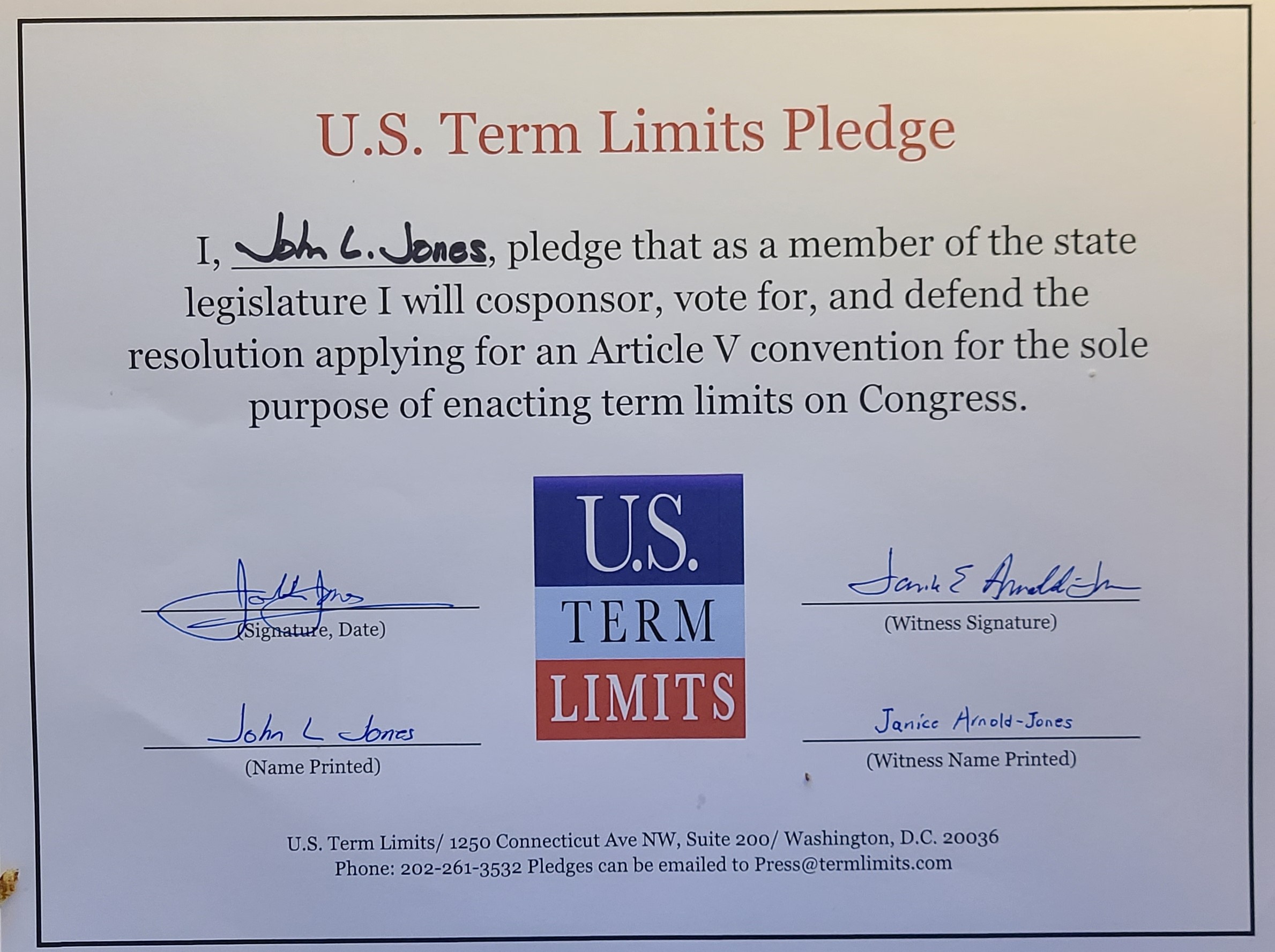 USTL President, Philip Blumel, commented on Jones’s pledge saying, “John’s support of term limits shows that there are individuals who are willing to listen to the majority of voters who want term limits. America needs a Congress that will be served by citizen legislators, not career politicians.”