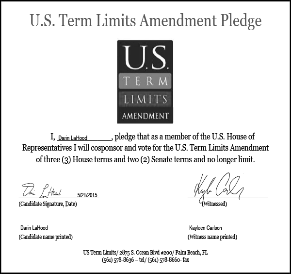 U.S. Term Limits has the support of more than 150 pledge signers in Congress. USTL President Philip Blumel commented on Kitover’s and LaHood’s pledges saying, “John’s and Darin’s strong support of term limits shows that there are individuals who are willing to put self-interest aside to follow the will of the people. America needs a Congress that will be served by citizen legislators, not career politicians.”