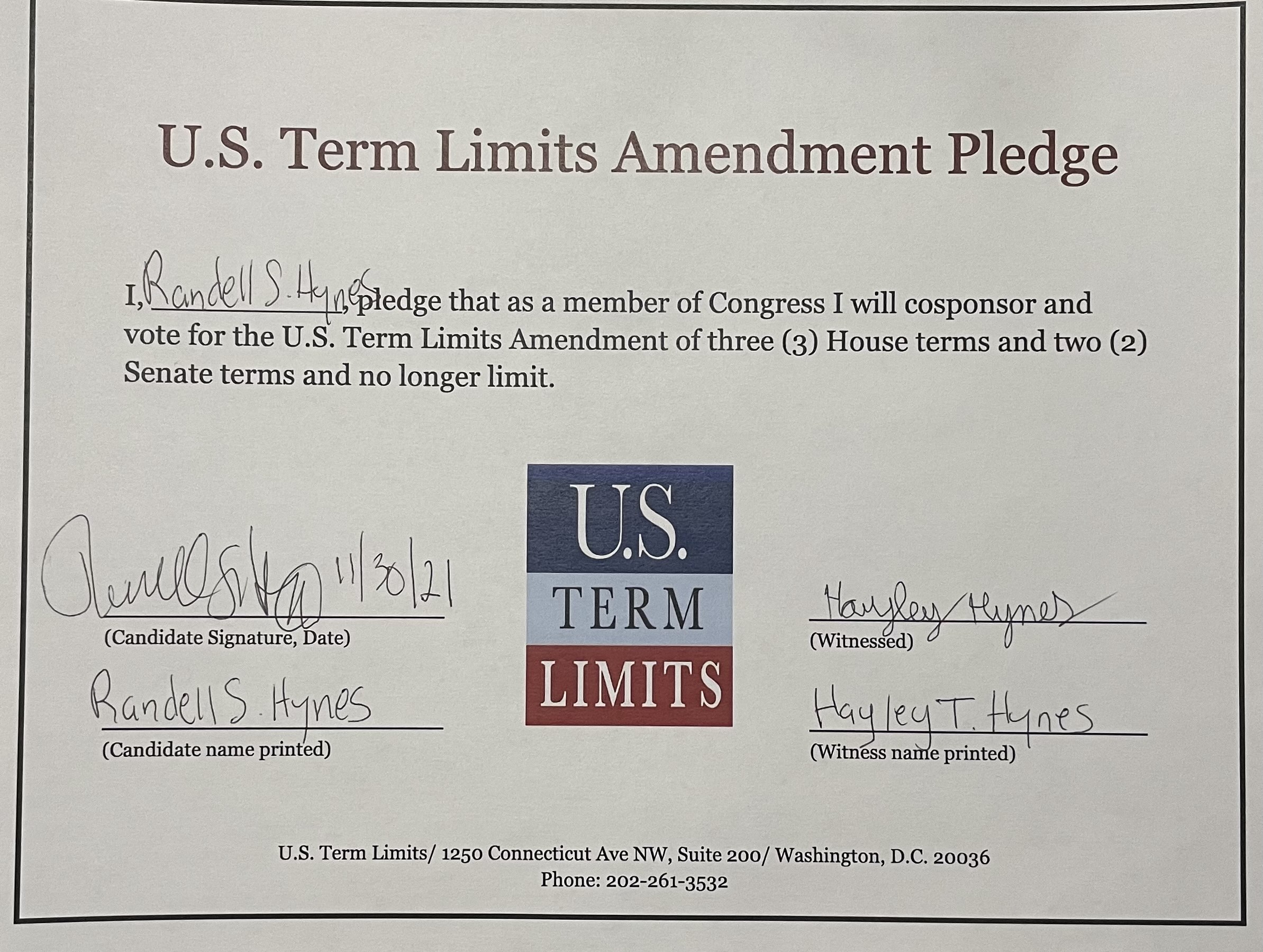 The U.S. Term Limits amendment pledge is provided to every announced candidate for federal office. It reads, “I pledge that as a member of Congress, I will cosponsor and vote for the U.S. Term Limits amendment of three (3) House terms and two (2) Senate terms and no longer limit.” The U.S. Term Limits constitutional amendment has been introduced in both the U.S. Senate by Senator Ted Cruz and his colleagues (SJR3) and the U.S. House by Representative Ralph Norman (HJR12).