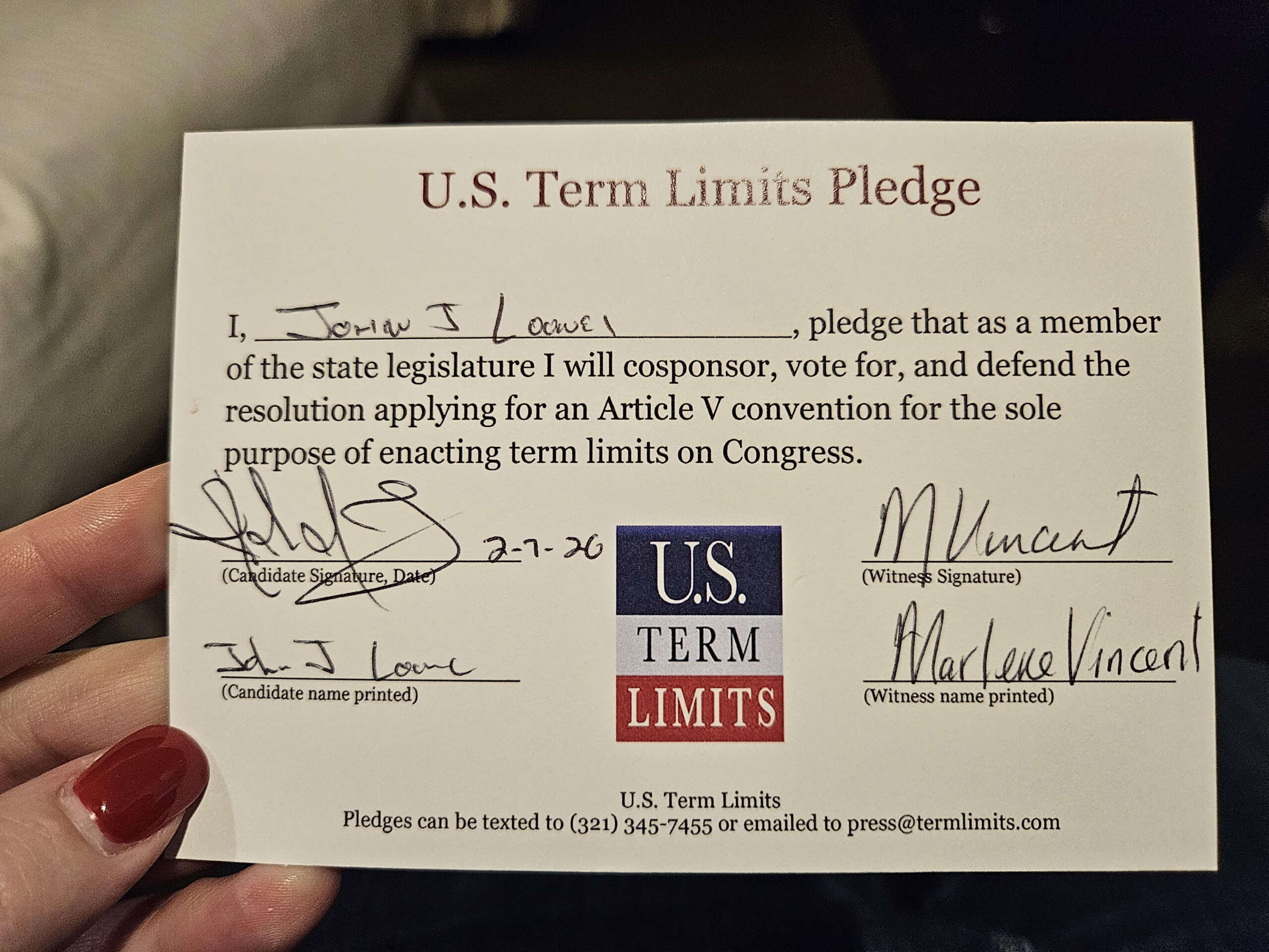 The U.S. Term Limits pledge is provided to candidates and members of state legislatures. It reads, “I pledge that, as a member of the state legislature, I will cosponsor, vote for, and defend the resolution applying for an Article V convention for the sole purpose of enacting term limits on Congress.”
