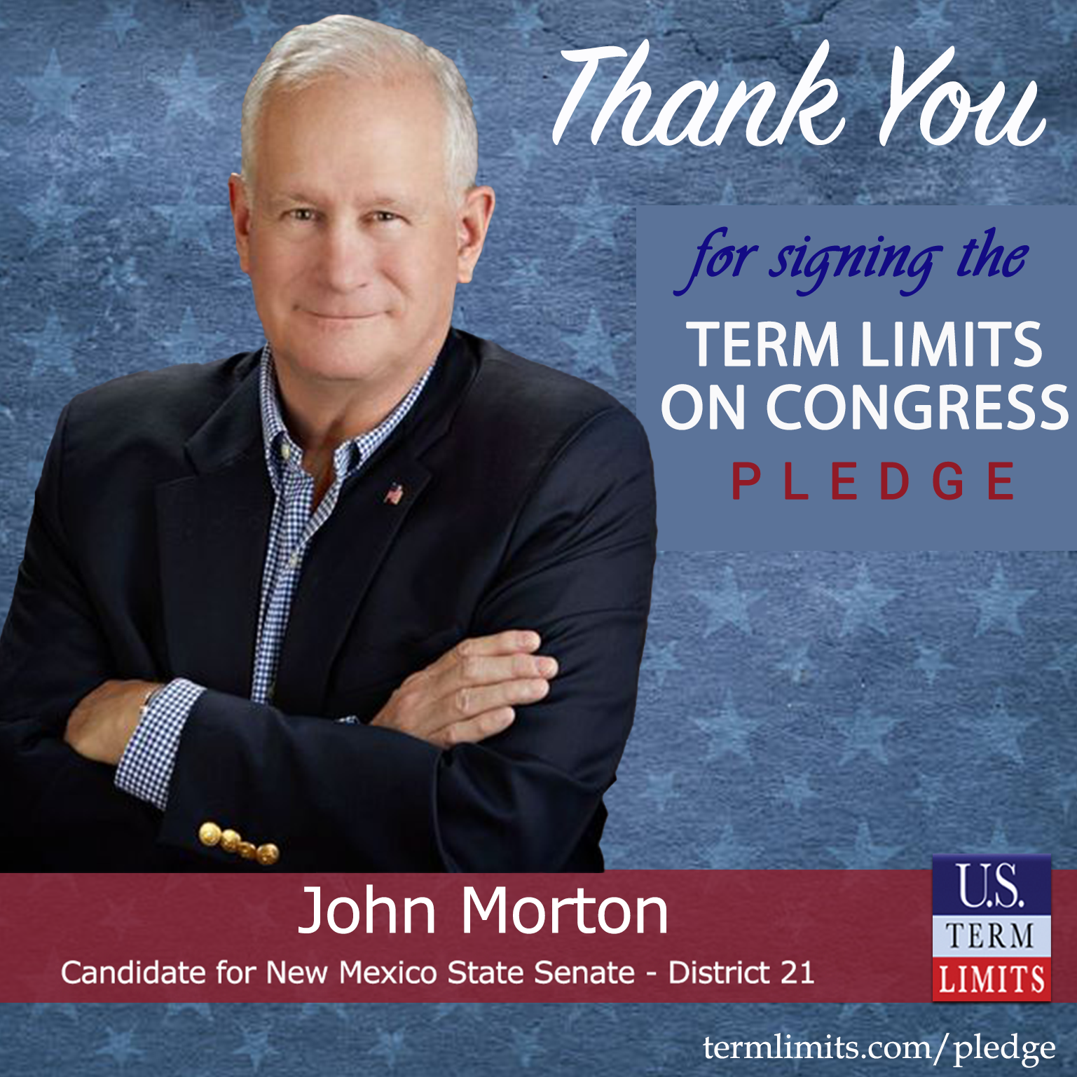 Albuquerque, NM – U.S. Term Limits (USTL), the leader in the national, non-partisan movement to limit terms for elected officials, is gathering support from state lawmakers across the nation. Its mission is to get 34 states to apply for an amendment proposal convention specific to term limits on Congress. New Mexico state senate candidate, John Morton (District 21), has committed support for term limits on Congress by signing the Term Limits Convention Pledge. Previously, candidate Michael Wiener also signed the pledge.