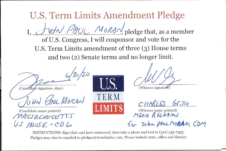 Washington, DC – U.S. Term Limits (USTL), the leader in the non-partisan national movement to limit terms for elected officials, praises 2020 U.S. house candidate for Massachuetts (district 6), John Paul Moran , for signing the pledge for an amendment to term limit Congress. Moran is the first signer in this race and has advanced from the primary on September 1, 2020.