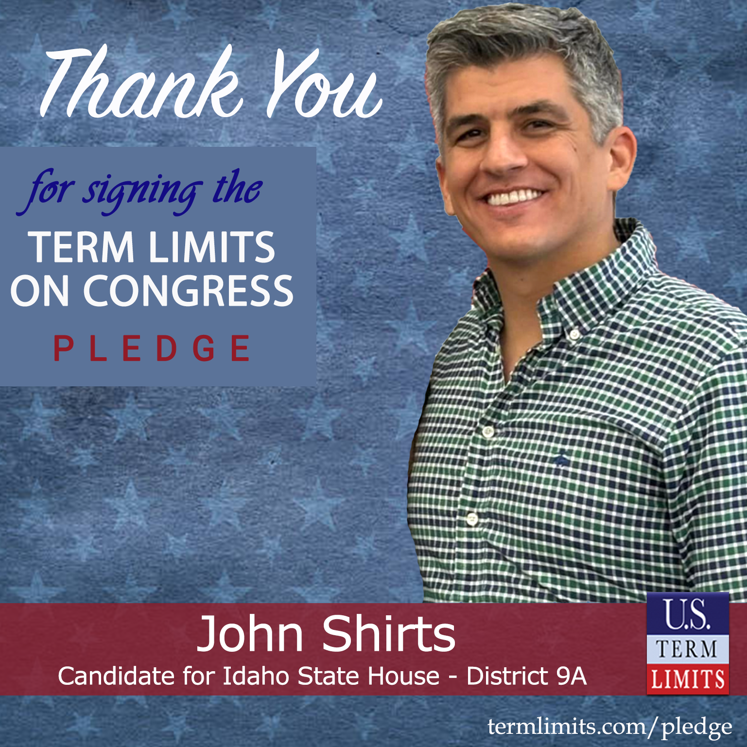 Weiser, ID – U.S. Term Limits (USTL), the leader in the national, non-partisan movement to limit terms for elected officials, is gathering support from state lawmakers across the nation. Its mission is to get 34 states to apply for an amendment proposal convention specific to term limits on Congress. Idaho state house candidate, John Shirts (District 9A), has committed support for term limits on Congress by signing the term limits convention pledge.