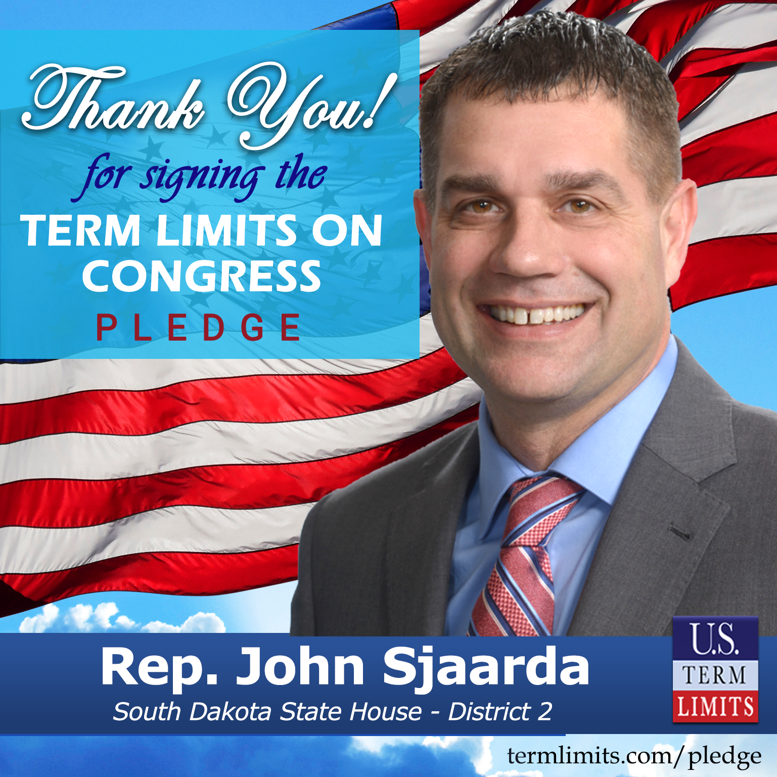 Valley Springs, SD – U.S. Term Limits (USTL), the leader in the national, non-partisan movement to limit terms for elected officials, is gathering support from state lawmakers across the nation. Its mission is to get 34 states to apply for an amendment proposal convention specific to term limits on Congress. South Dakota state Rep. John Sjaarda (District 2), has committed support for term limits on Congress by signing the Term Limits Convention Pledge.