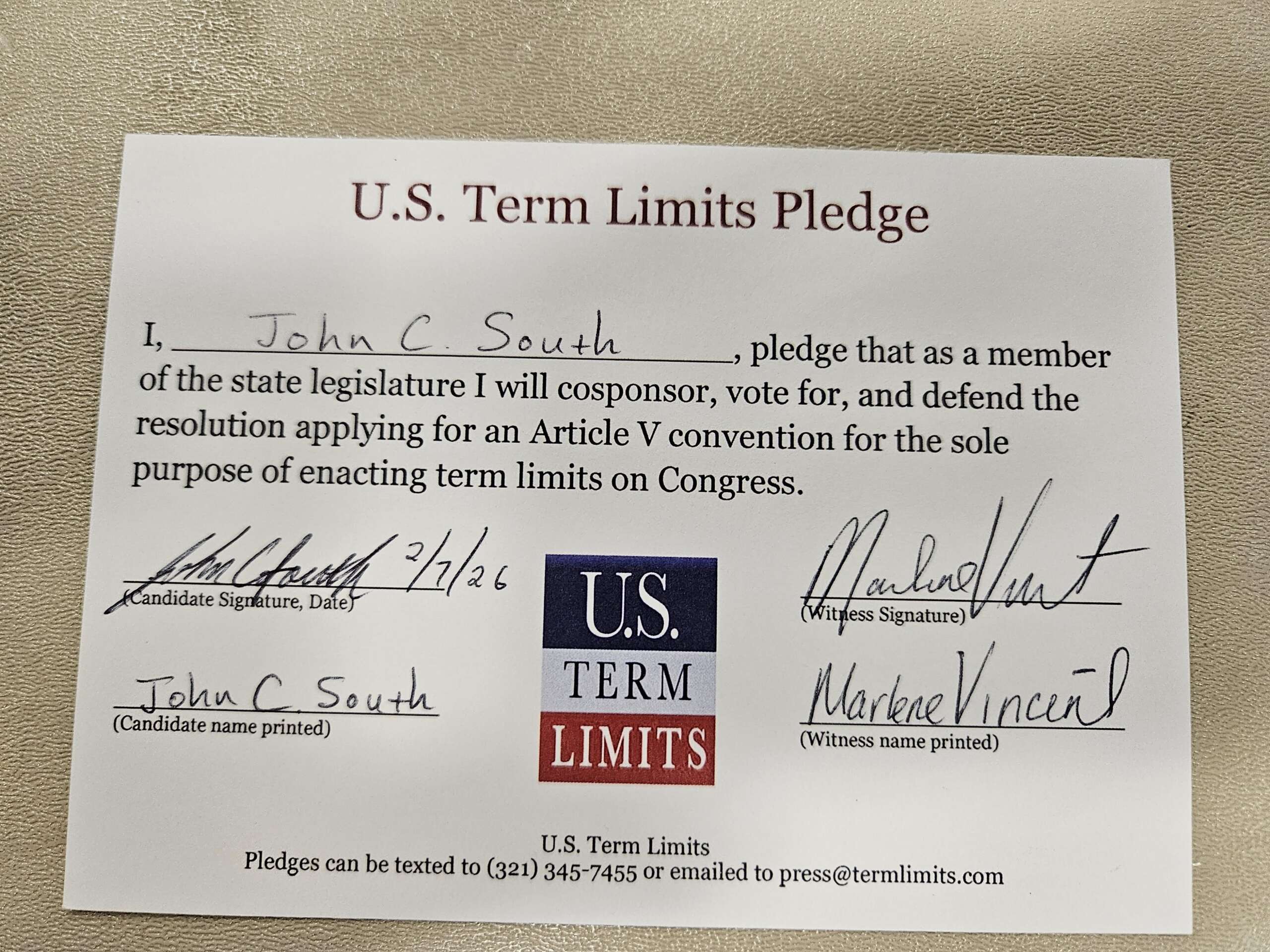 John South Pledges to Support Congressional Term Limits
