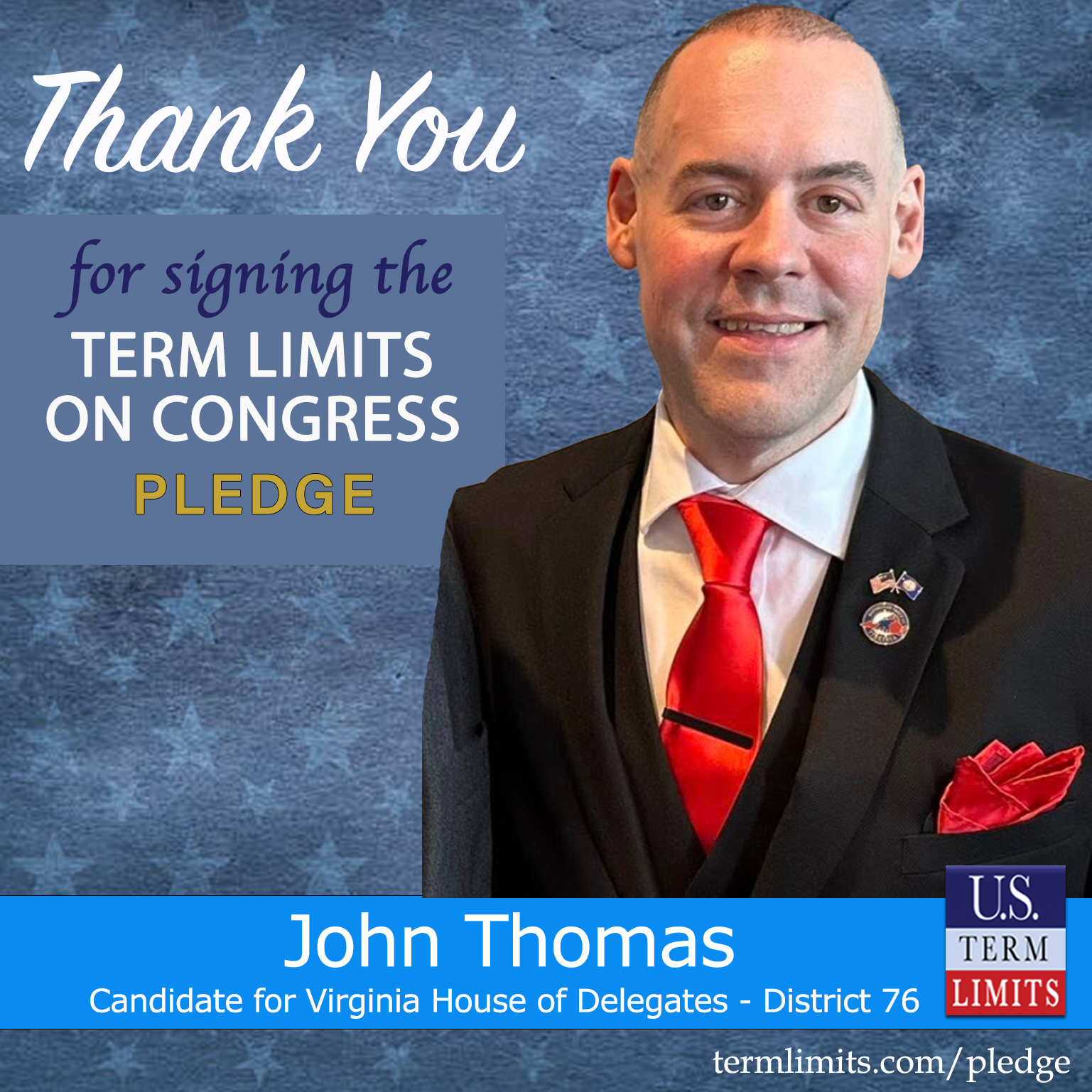 Richmond, VA – U.S. Term Limits (USTL), the leader in the national, non-partisan movement to limit terms for elected officials, is gathering support from state lawmakers across the nation. Its mission is to get 34 states to apply for an amendment proposal convention specific to term limits on Congress. 2025 Virginia house of delegates candidate, John Thomas (district 76), has committed support for term limits on Congress by signing the term limits convention pledge.