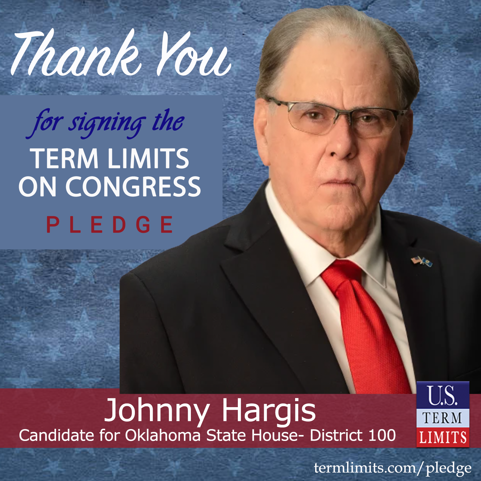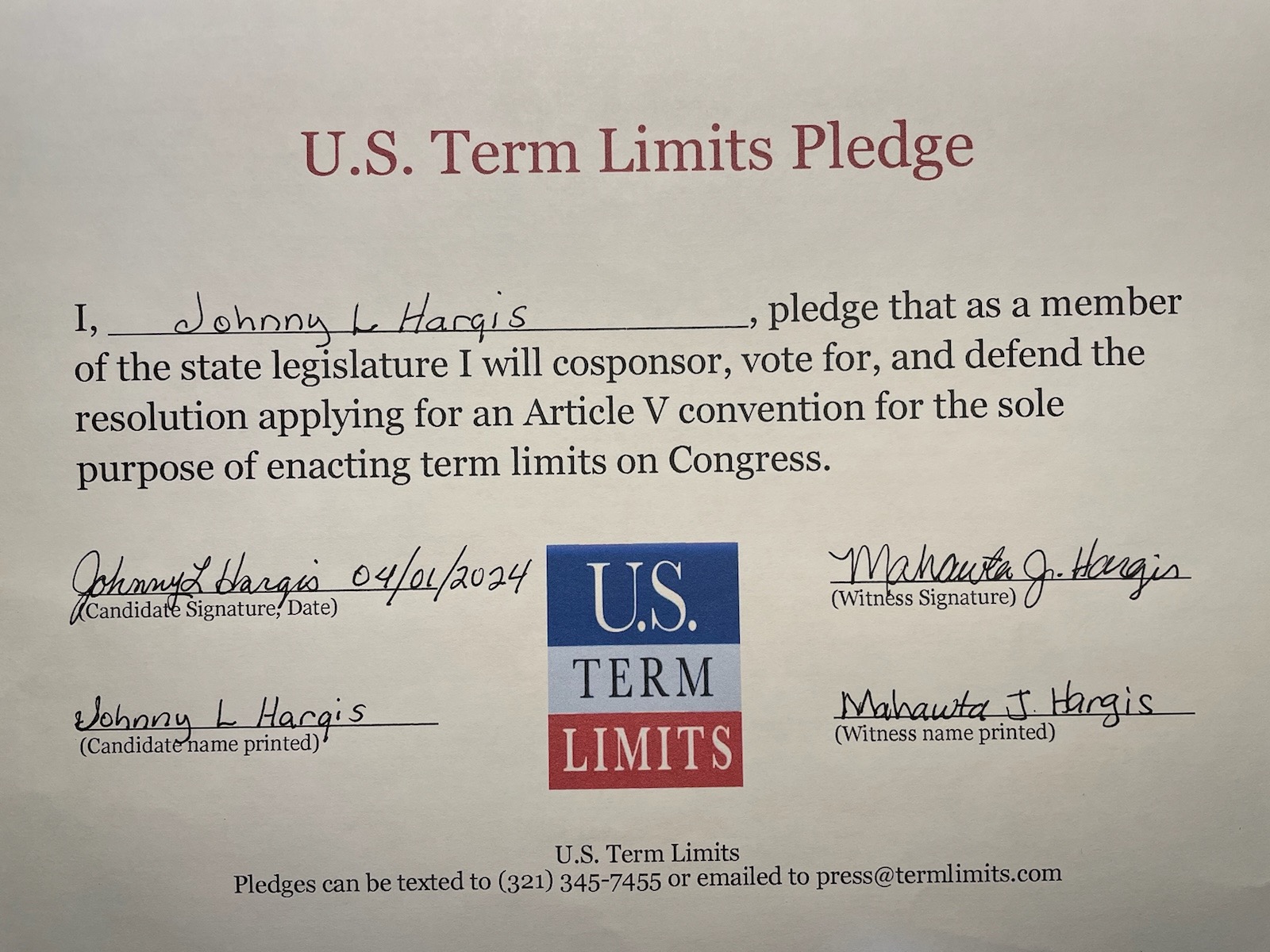 USTL President, Philip Blumel, commented on Hargis’s pledge saying, “Johnny’s strong support of term limits shows that there are individuals who are willing to listen to the majority of voters who want term limits. America needs a Congress that will be served by citizen legislators, not career politicians.”