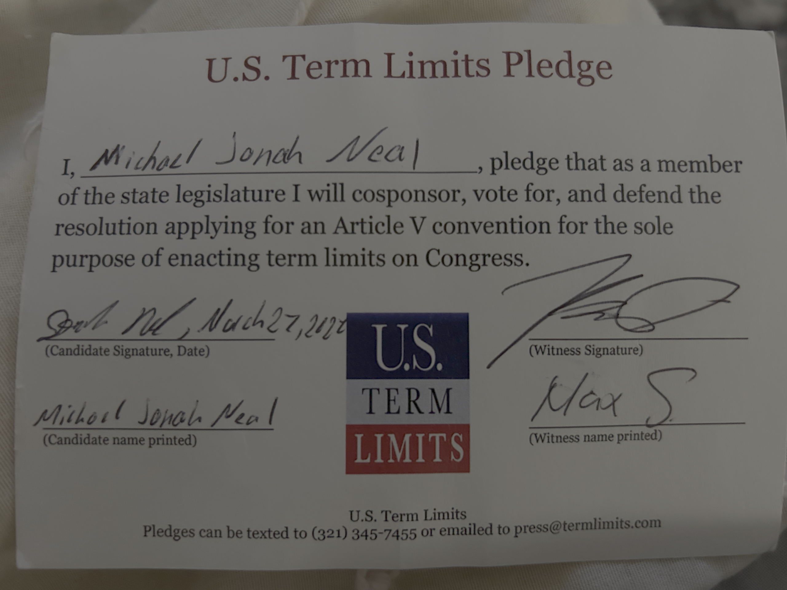 Jonah Neal Pledges to Support Congressional Term Limits