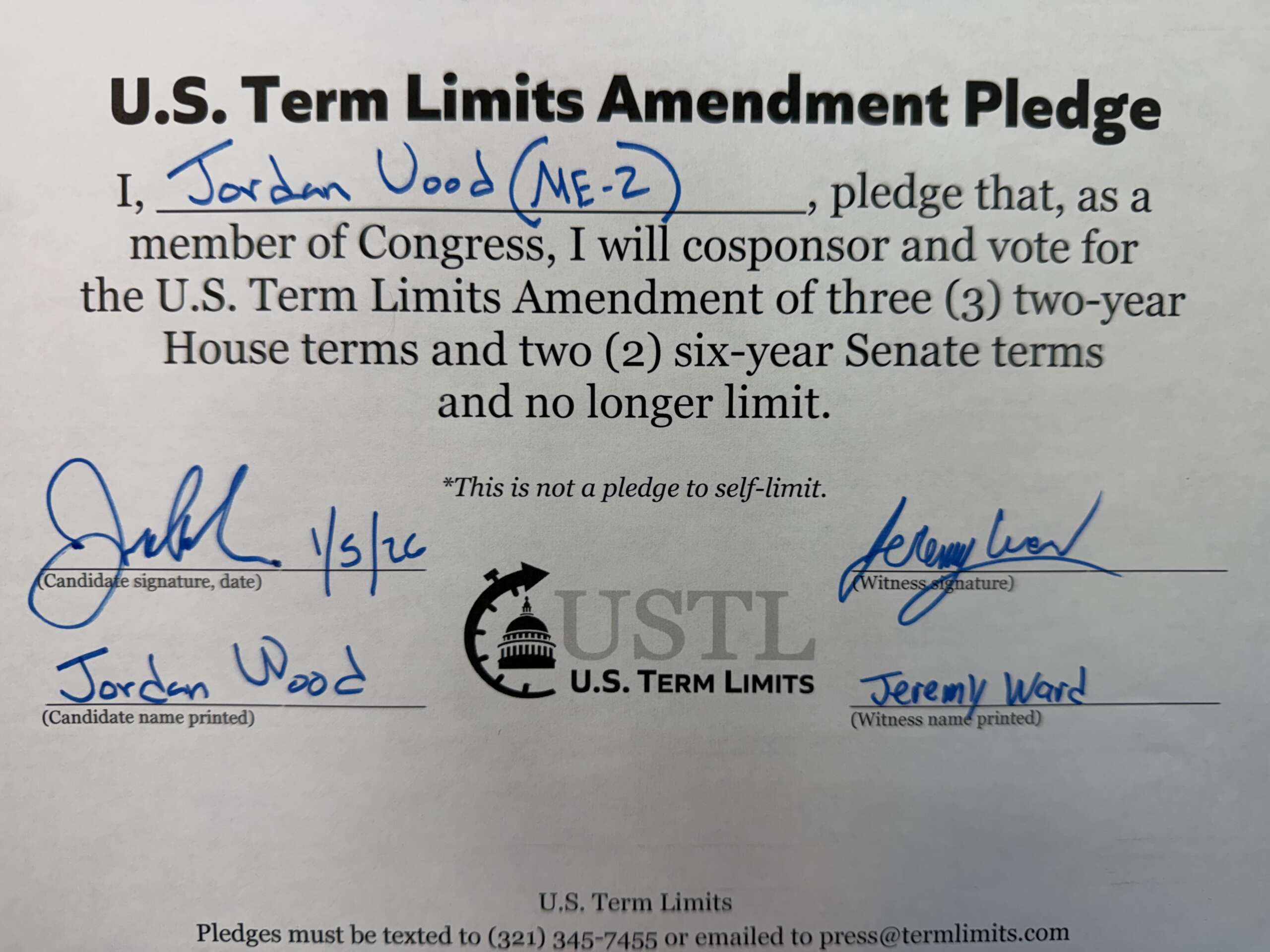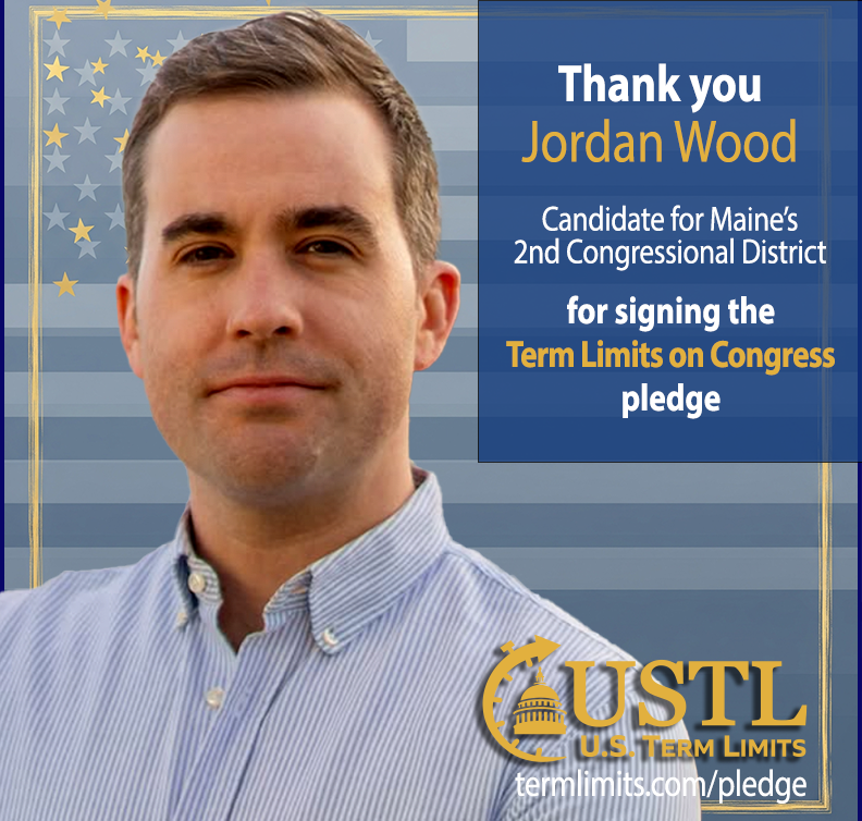Washington D.C. – U.S. Term Limits (USTL), the leader in the non-partisan national movement to limit terms for elected officials, praises 2026 U.S. House of Representatives candidate for Maine, Jordan Wood (district 2), for signing the pledge for an amendment to term limit Congress. Previously, candidate James Clark also signed the pledge.