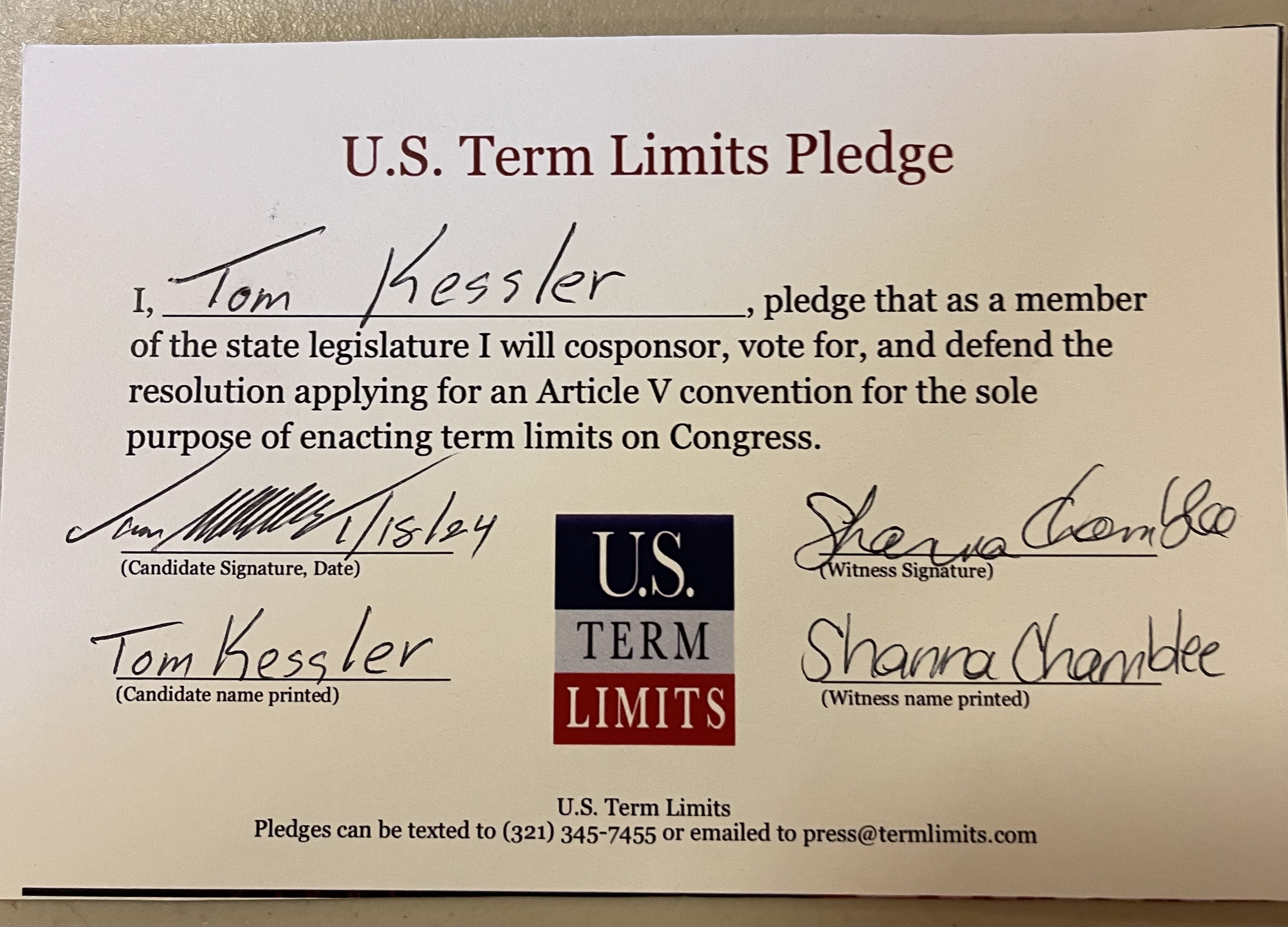 The U.S. Term Limits pledge is provided to candidates and members of state legislatures. It reads, “I pledge that, as a member of the state legislature, I will cosponsor, vote for, and defend the resolution applying for an Article V convention for the sole purpose of enacting term limits on Congress.”