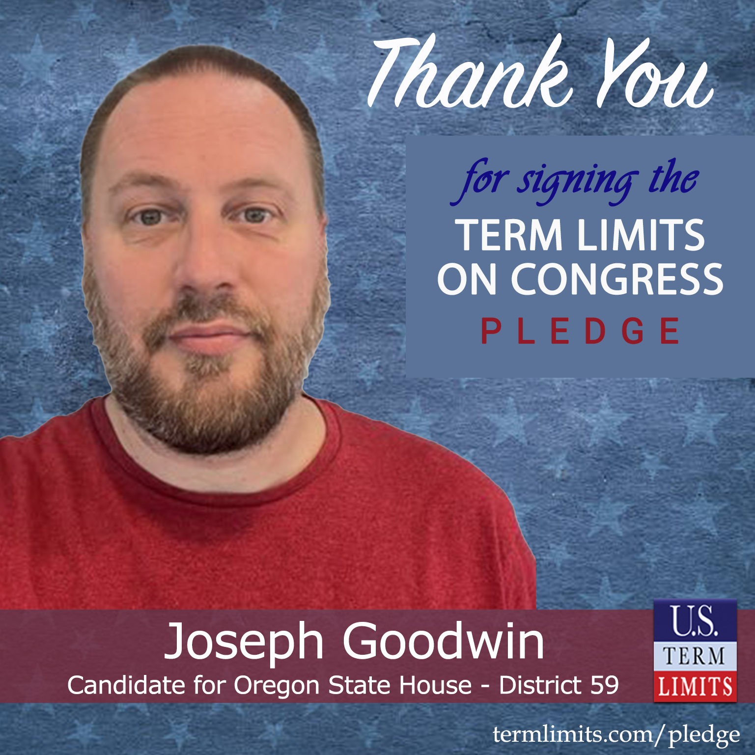 Madras, OR – U.S. Term Limits (USTL), the leader in the national, non-partisan movement to limit terms for elected officials, is gathering support from state lawmakers across the nation. Its mission is to get 34 states to apply for an amendment proposal convention specific to term limits on Congress. Oregon state house candidate, Joseph Goodwin (District 59), has committed support for term limits on Congress by signing the Term Limits Convention Pledge.