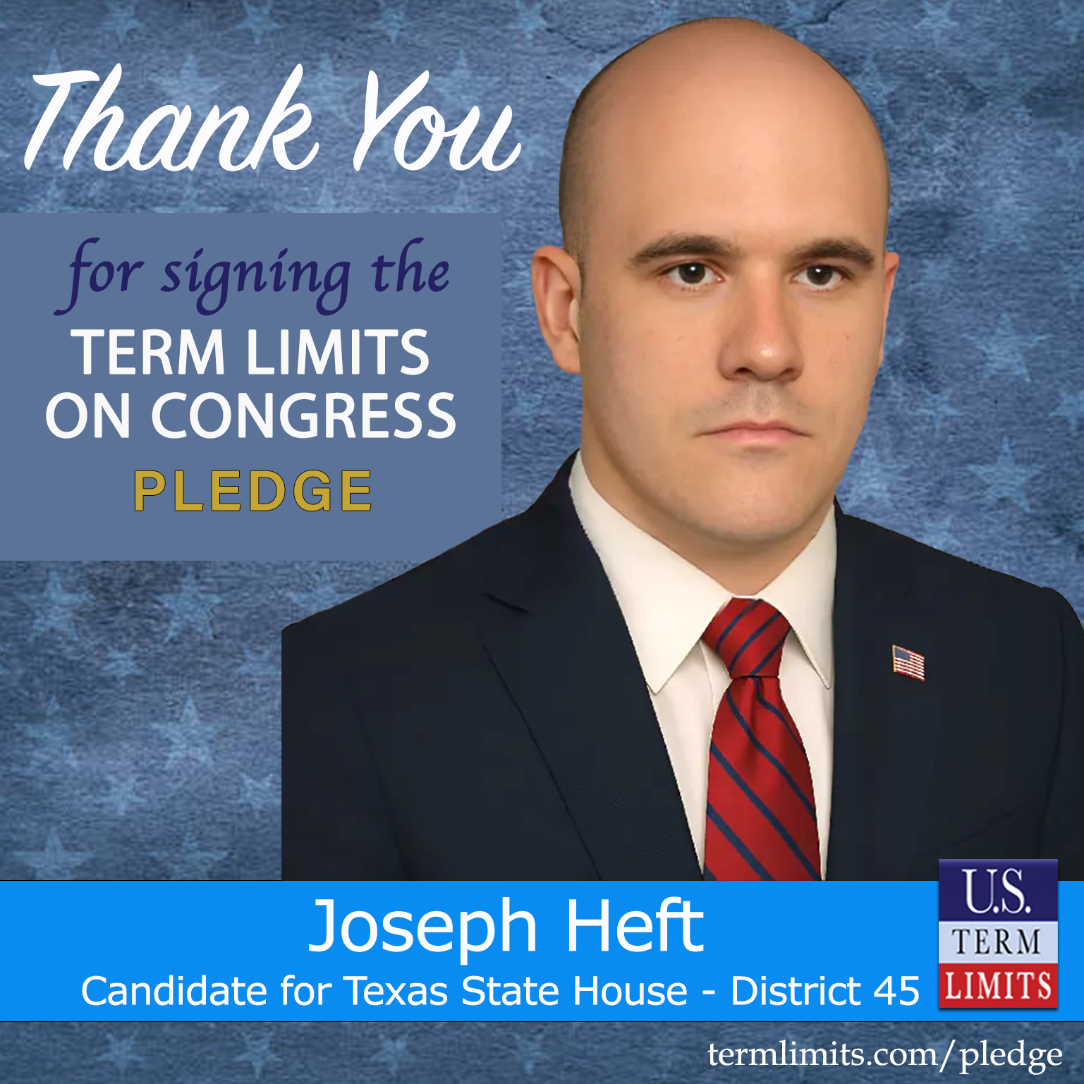 Mountain City, TX – U.S. Term Limits (USTL), the leader in the national, non-partisan movement to limit terms for elected officials, is gathering support from state lawmakers across the nation. Its mission is to get 34 states to apply for an amendment proposal convention specific to term limits on Congress. 2026 Texas state house candidate, Joseph Heft (district 45), has committed support for term limits on Congress by signing the term limits convention pledge.