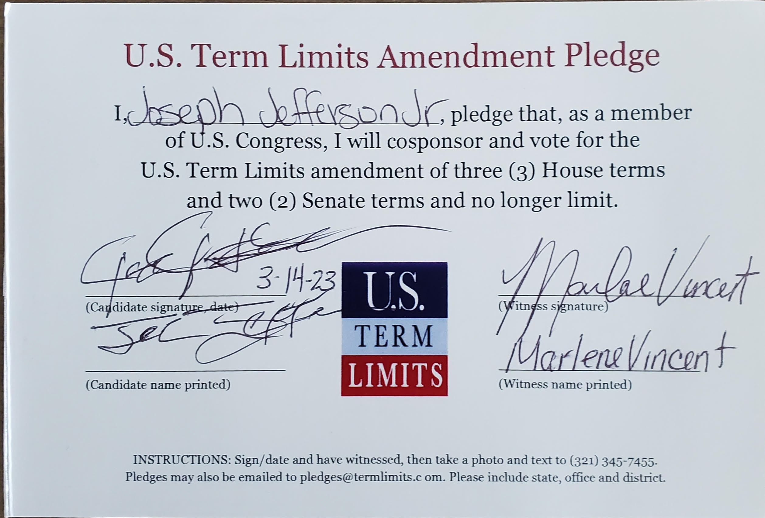 USTL President, Philip Blumel, commented on Jefferson’s pledge saying, “Joseph’s support of term limits shows that there are individuals who are willing to listen to the majority of voters who want term limits. America needs a Congress that will be served by citizen legislators, not career politicians.”