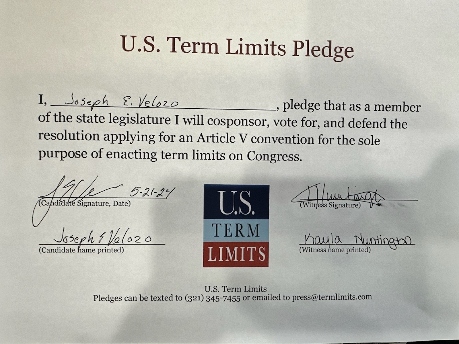 Joseph Velozo Pledges to Support Congressional Term Limits