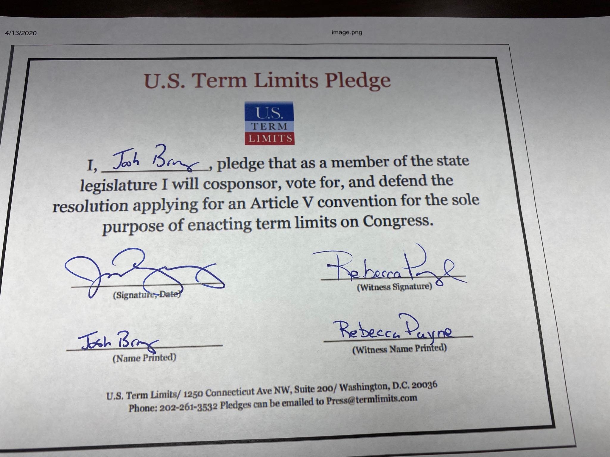 Josh Bray Pledges to Support Congressional Term Limits