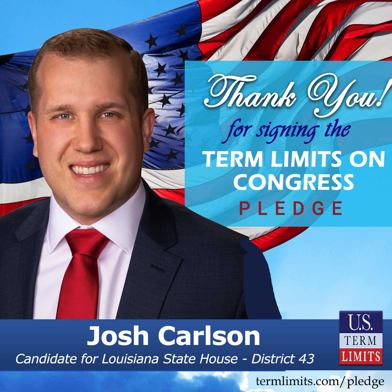 Baton Rouge, LA – U.S. Term Limits (USTL), the leader in the national, non-partisan movement to limit terms for elected officials, is gathering support from state lawmakers across the nation. Its mission is to get 34 states to apply for an amendment proposal convention specific to term limits on Congress. Louisiana state house candidate, Josh Carlson (District 43), has committed support for term limits on Congress by signing the term limits convention pledge. Carlson is the first signer in this race.