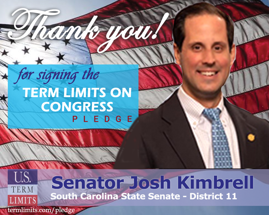 Columbia, SC – U.S. Term Limits (USTL), the leader in the national, non-partisan movement to limit terms for elected officials, is gathering support from state lawmakers across the nation. Its mission is to get 34 states to apply for an amendment proposal convention specific to term limits on Congress. South Carolina state Senator Josh Kimbrell (district 11), has committed support for term limits on Congress by signing the Term Limits Convention pledge.
