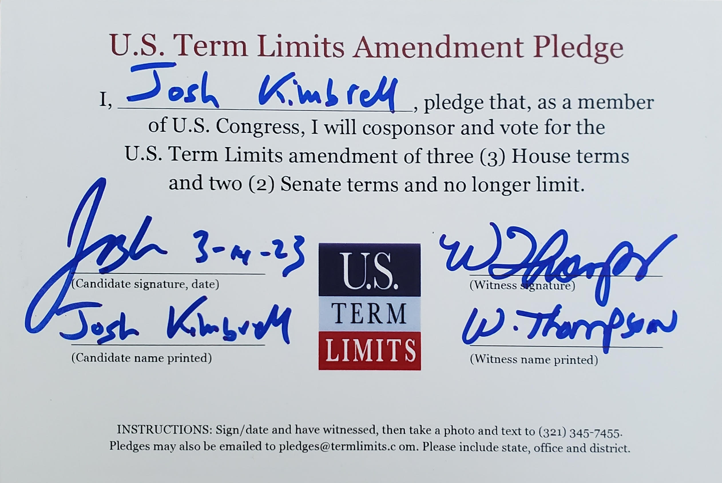 USTL President, Philip Blumel, commented on Kimbrell’s pledge saying, “Josh’s support of term limits shows that there are individuals who are willing to listen to the majority of voters who want term limits. America needs a Congress that will be served by citizen legislators, not career politicians.”