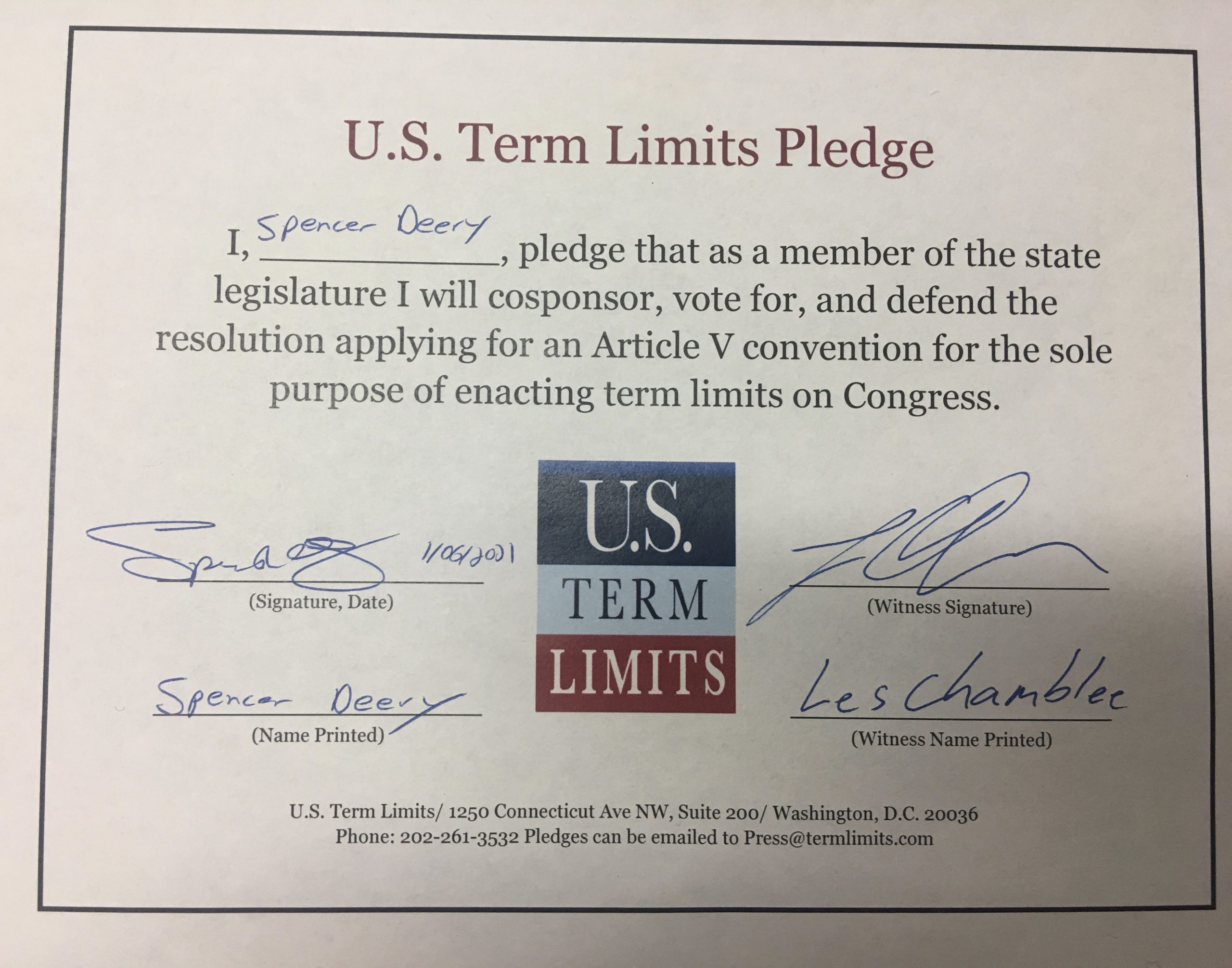The U.S. Term Limits pledge is provided to candidates and members of state legislatures. It reads, “I pledge that, as a member of the state legislature, I will cosponsor, vote for, and defend the resolution applying for an Article V convention for the sole purpose of enacting term limits on Congress.”