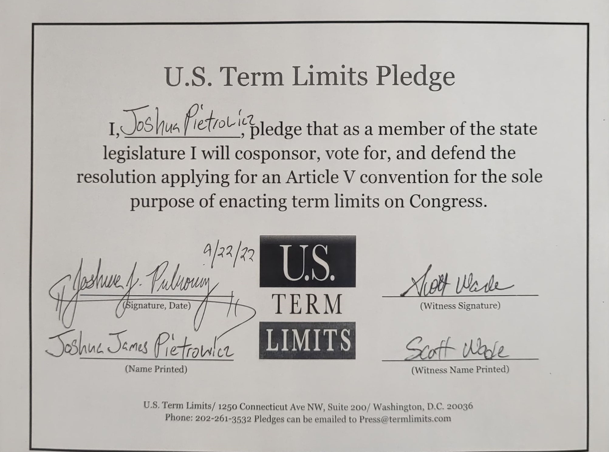 USTL President, Philip Blumel, commented on Pietrowicz’s pledge saying,  “Joshua’s support of term limits shows that there are individuals who are willing to listen to the majority of voters who want term limits. America needs a Congress that will be served by citizen legislators, not career politicians.”