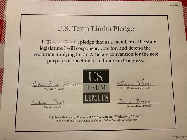 USTL President, Philip Blumel, commented on Prine’s pledge saying, “Joshua’s support of term limits shows that there are individuals who are willing to listen to the majority of voters who want term limits. America needs a Congress that will be served by citizen legislators, not career politicians.”