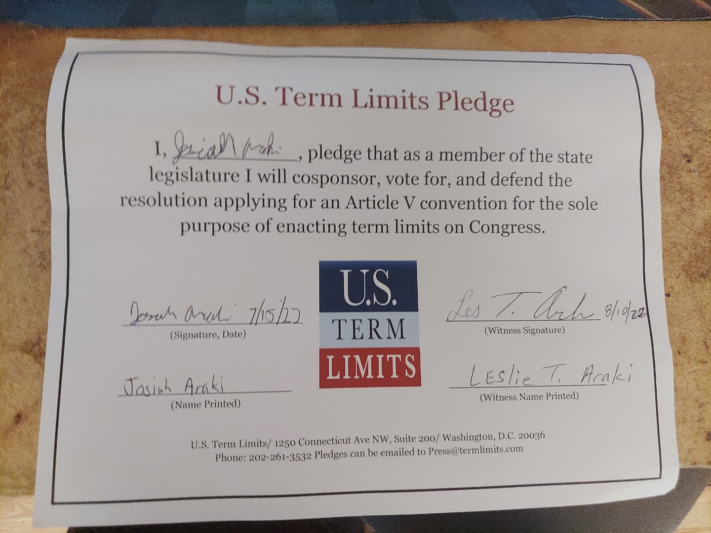 Waipahu, HI– U.S. Term Limits (USTL), the leader in the national, non-partisan movement to limit terms for elected officials, is gathering support from state lawmakers across the nation. Its mission is to get 34 states to apply for an amendment proposal convention specific to term limits on Congress. Hawaii state house candidate, Josiah Araki (district 35), has committed support for term limits on Congress by signing the U.S. Term Limits pledge. Araki is the first signer in this race.