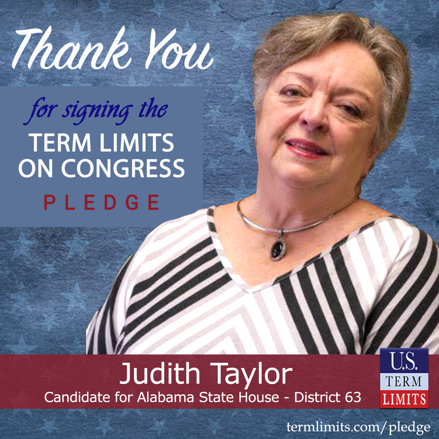 Tuscaloosa, AL – U.S. Term Limits (USTL), the leader in the national, non-partisan movement to limit terms for elected officials, is gathering support from state lawmakers across the nation. Its mission is to get 34 states to apply for an amendment proposal convention specific to term limits on Congress. 2026 Alabama state house candidate, Judith Taylor (district 63), has committed support for term limits on Congress by signing the term limits convention pledge. Taylor is the first signer in this race.