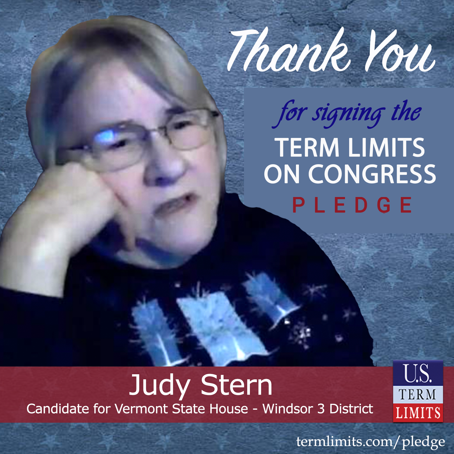 Springfield, VT – U.S. Term Limits (USTL), the leader in the national, non-partisan movement to limit terms for elected officials, is gathering support from state lawmakers across the nation. Its mission is to get 34 states to apply for an amendment proposal convention specific to term limits on Congress. Vermont state house candidate, Judy Stern (Windsor 3 district), has committed support for term limits on Congress by signing the term limits convention pledge.