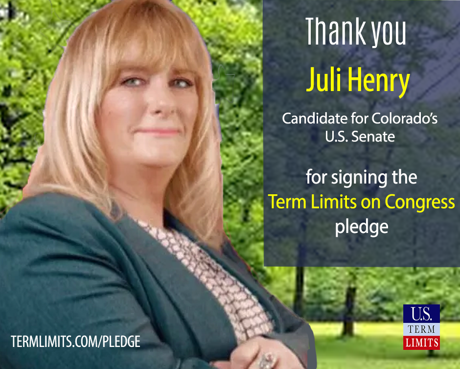 Washington D.C. – U.S. Term Limits (USTL), the leader in the non-partisan national movement to limit terms for elected officials, praises 2022 U.S. senate candidate for Colorado, Juli Henry, for signing the pledge for an amendment to term limit Congress. Henry is the first signer in this race.