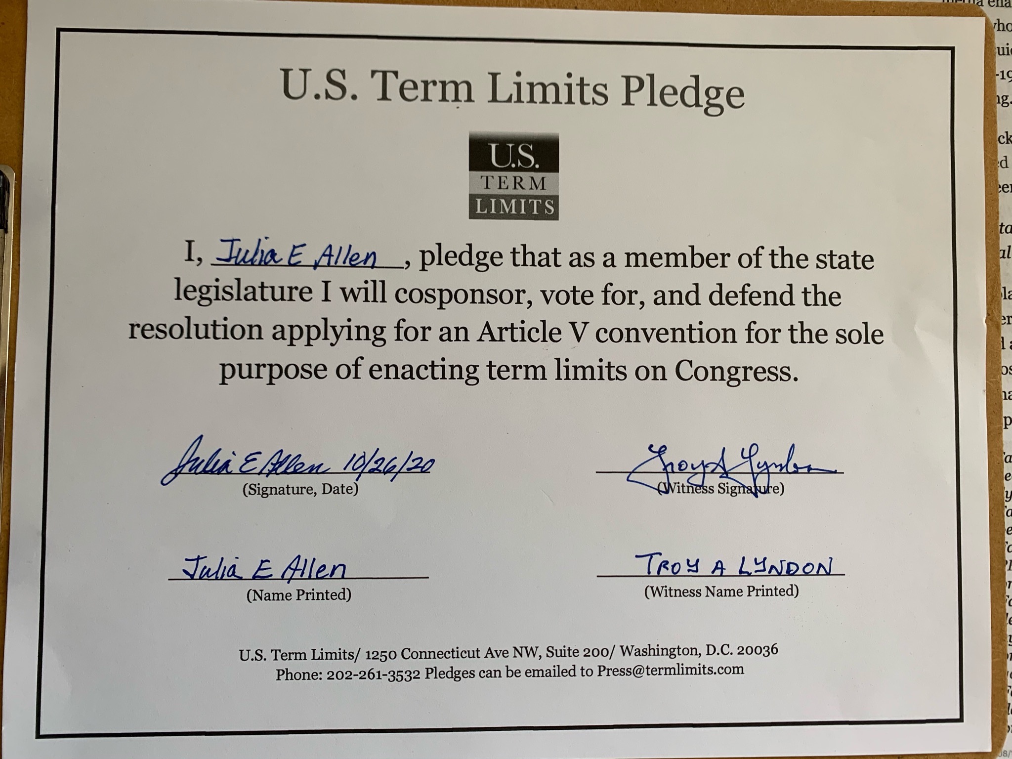 Julia Allen Pledges to Support Congressional Term Limits