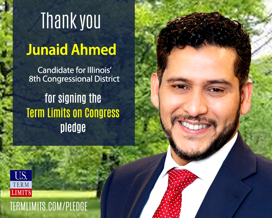 Washington D.C. – U.S. Term Limits (USTL), the leader in the non-partisan national movement to limit terms for elected officials, praises 2022 U.S. house candidate for Illinois, Junaid Ahmed district 8), for signing the pledge for an amendment to term limit Congress.